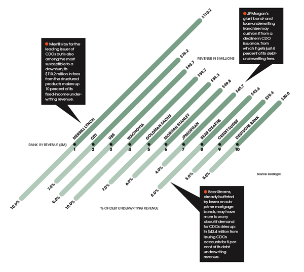 投资银行获得了承保CDO的费用,并从这些产品为LBO所创造的债务带来的流动性中受益。根据Dealogic的说法,前十名承销商中有几个依靠CDO来获得其固定收益收入的大部分收入。最依赖CDO的人是Merrill Lynch&Co。和Wachovia Corp.,分别为10%,其次是9%,Bear,Stearns&Co。占8%。