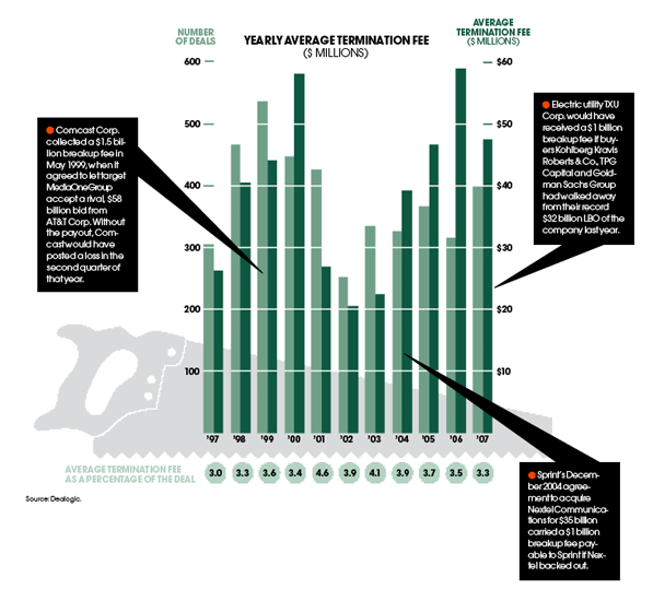 分手费在1980年代首次引入并购市场,多年来越来越受欢迎。根据研究公司Dealogic的数据,去年的并购交易中有56%从1997年的三分之一提高了此类费用。总共,2007年的396笔交易收取了分手费,平均费用为4,720万美元。最初是为了保护买家而建立的,如果目标公司退出交易,最近卖方坚持终止费用。在过去几年的杠杆购买繁荣中,这种反向分手付款变得特别受欢迎,因为电子支付处理器First Data Corp.和Utility TXU Corp.等目标,如果LBO公司无法获得交易债务融资,则要求保护。