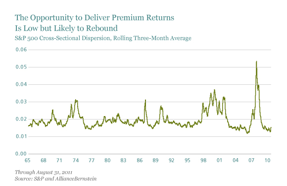 相关性,波动性和分散体是所有流体统计;例如,我们预计相关性以雕刻出新的,略高,平均值,但仍然从他们目前的高水平撤退。鉴于欧洲主权危机和全球经济增长的不确定性,股票持久性可能会在近期延长。总的来说,效果应该是增加分散,因为实际上可能只是开始发生。积极管理人员将突然飙升,甚至略有升级,使他们的研究能够将小麦分离成千上万的股票中的糠。