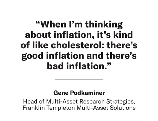 In the following conversation, two key players at Franklin Templeton Multi-Asset Solutions—Wylie Tollette, Head of Client Investment Solutions, and Gene Podkaminer, Head of Multi-Asset Research Strategies—consider the “what if” of inflation, including why it’s like a ninja (and a bit like cholesterol)
