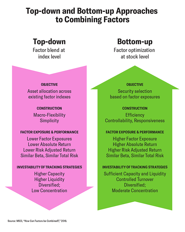 为各个因素进行分配通常需要强大的投资信念,因为因素回报本质上是周期性的。在一项研究中,MSCI使用了自下而上的方法来构建来自有利地暴露于价值,大小,质量和动量因子的股票的多因素指数,并将其与单个因子指标相结合的替代自上而下方法。在其对目标因素的暴露程度以及其容量和可投资概况方面进行了比较这两种方法。