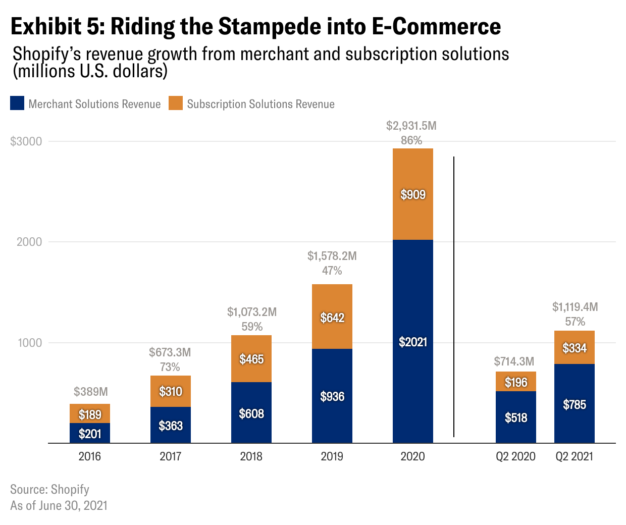 加拿大的Shopify是另一个技术推动者的例子,但其服务范围更广。该公司为寻求建立在线店面的企业提供一站式服务,省去了数字支付管理和网站创建的麻烦。Shopify让所有类型的公司和企业家都能很容易地在网上快速建立业务,同时与客户保持直接的品牌关系(而不是通过亚马逊销售产品等间接关系)。Shopify还允许客户处理多个不同供应商的在线支付,如ApplePay或谷歌钱包,减轻了建立和维护独立支付服务的繁重任务。随着越来越多的公司参与电子商务,Shopify从不断增长的需求中受益匪浅(见表5)。